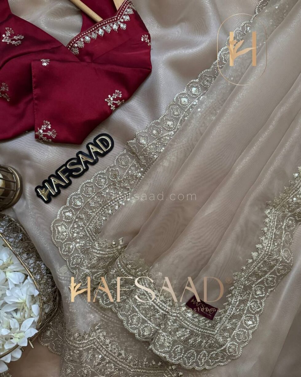 Presenting an exclusive designer creation from Nice Creation, Design No. NC – 5441. This stunning saree is crafted from Heavy Soft Nylon Organza, offering a graceful drape. It features intricate sequins and Zari embroidery work throughout, creating a dazzling effect. The ensemble is completed with a matching blouse in Soft Satin, adorned with coordinating Zari and sequins embroidery. This exquisite and radiant saree is available for ₹4,698.00, perfect for making a statement.