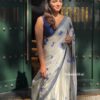 Women’s Exquisite Lavender & White Organza Saree with Hand-Painted Lotus Floral Motifs & Gold Embellished Border – Complete with Matching Printed Blouse for Festive & Special Occasions